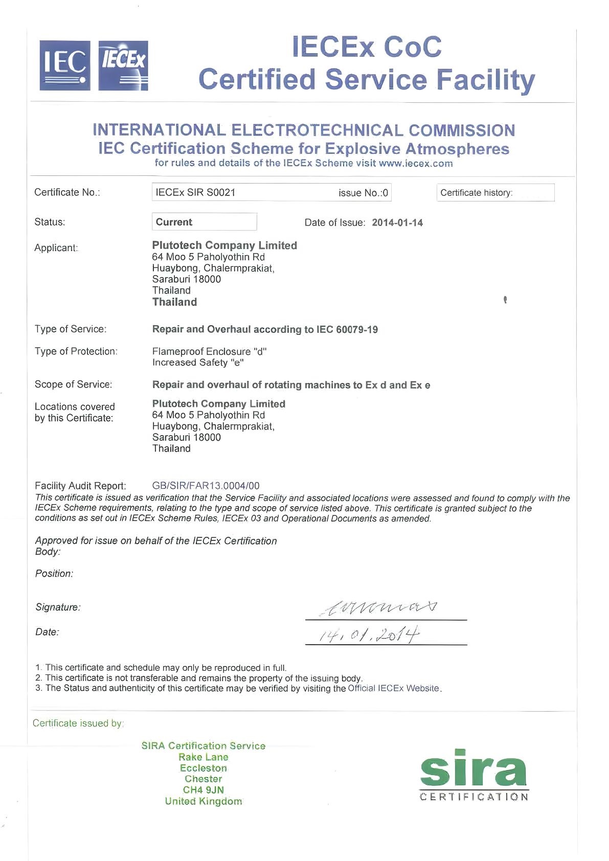 Certificate No.: IECEx SIR S0021 | Status: Current | Standard/Requirement: IEC 60079-19